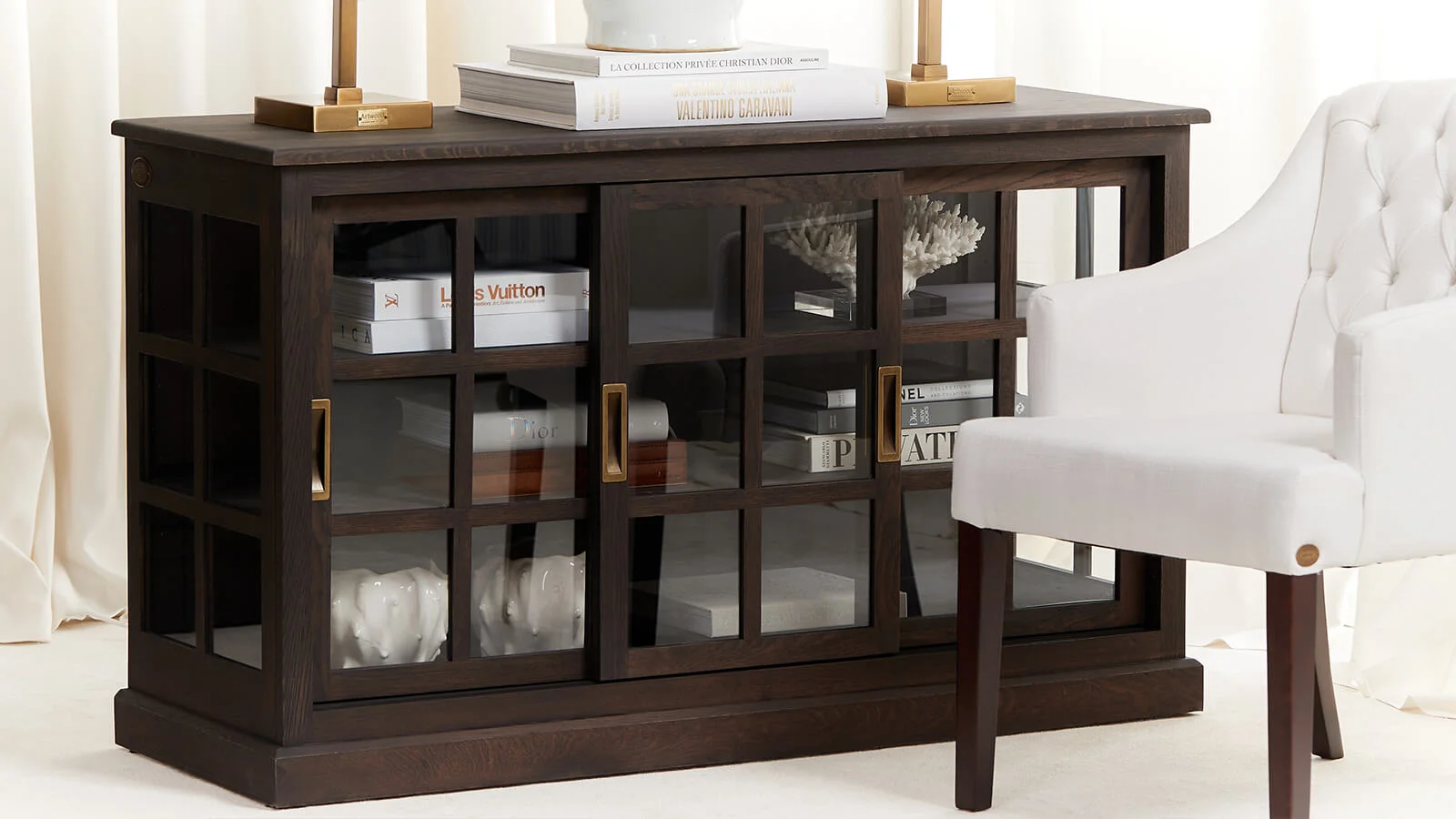 Materialvalg: Tenk på materialene i vitrineskapet ditt. For eksempel, hvis det er blankt, kan du balansere det med lakkerte gjenstander.